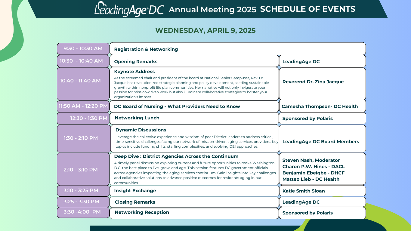 More details about the schedule and event location will be shared soon. If you have any questions or special requests, please don’t hesitate to contact LeadingAge DC at LADC@leadingage.org.