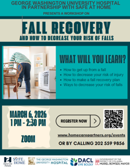 Join us on Friday, March 6, 2026, from 1:00–2:30 PM for an informative workshop on fall recovery and prevention. Medical professionals from Safe at Home and George Washington University Hospital will share guidance on how to safely get up after a fall, reduce your risk of injury, create a fall recovery plan, and understand what to expect if hospital care is needed following a fall.
